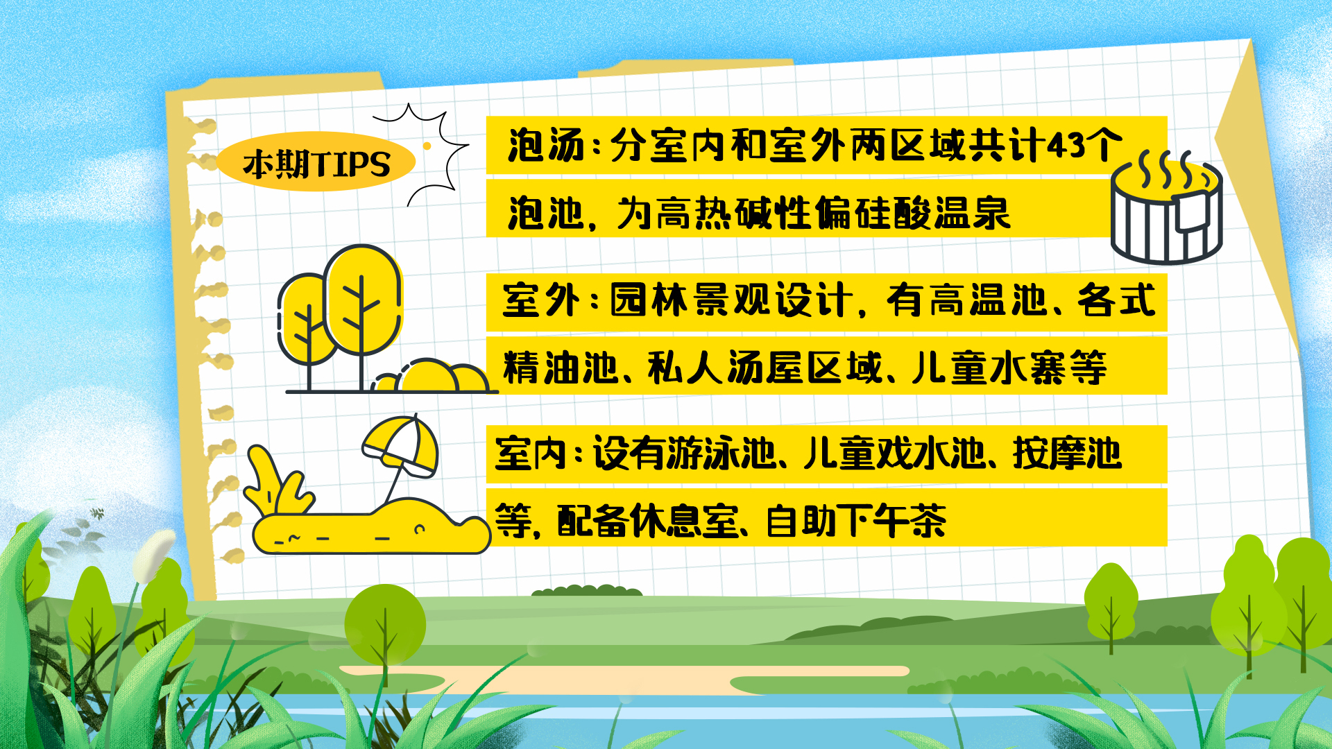 室外:园林景不雅盘算,有高温池、多样精油池、私东说念主汤屋区域、儿童水寨等